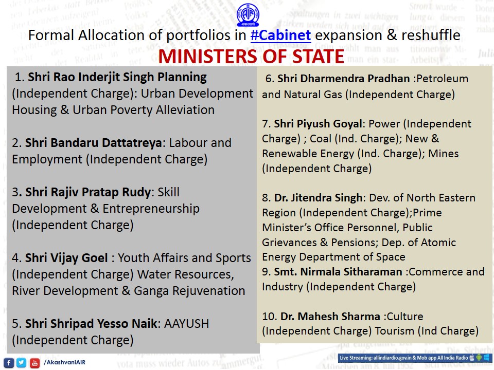 Formal Allocation of portfolios in Cabinet expansion & reshuffle of Narendra Modi's Government
